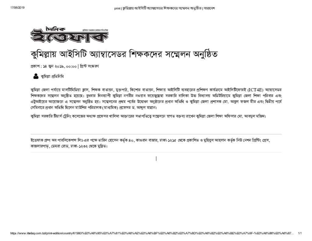 print _ কুমিল্লায় আইসিটি অ্যাম্বাসেডর শিক্ষকদের সম্মেলন অনুষ্ঠিত _ সারাদেশ Published on Newspaper দৈনিক ইত্তেফাক Category ICT Education Download