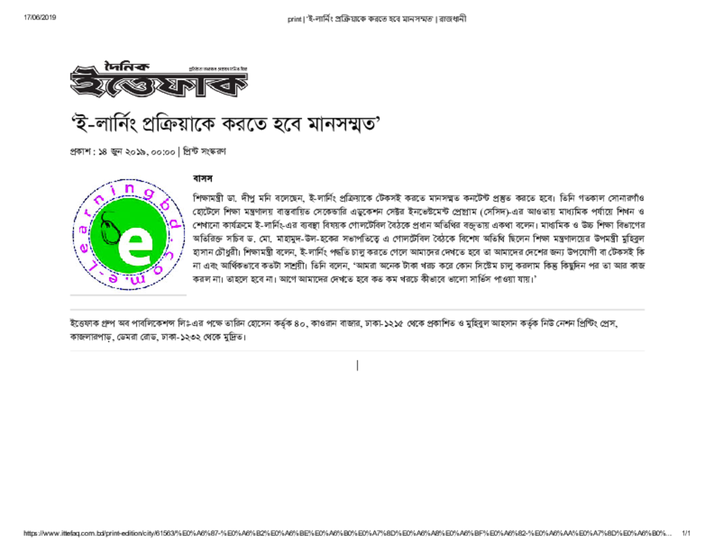 print _ ‘ই-লার্নিং প্রক্রিয়াকে করতে হবে মানসম্মত’ _ রাজধানী Published on Newspaper দৈনিক ইত্তেফাক Category ICT Education Download