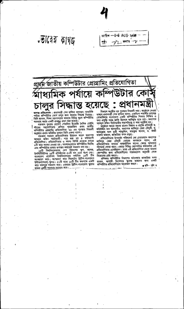 প্রথম জতীয় কম্পিউটার প্রোগ্রামিং প্রতিযোগিতা মাধ্যমিক পর্যায়ে কম্পিউটার কোর্স চালুর সিদ্ধান্ত হয়েছে : প্রধানমন্ত্রী