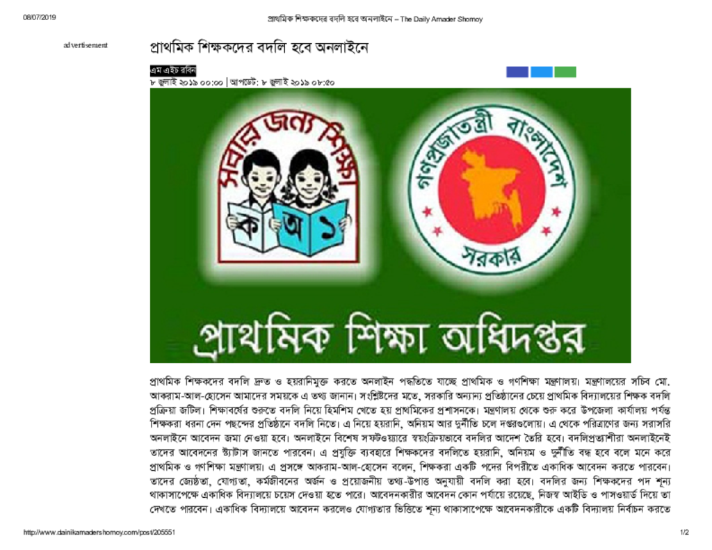 প্রাথমিক শিক্ষকদের বদলি হবে অনলাইনে – The Daily Amader Shomoy Published on Newspaper দৈনিক আমাদের সময় Category Educational Ministry / Departments Education Ministry / Division / Directorate Download