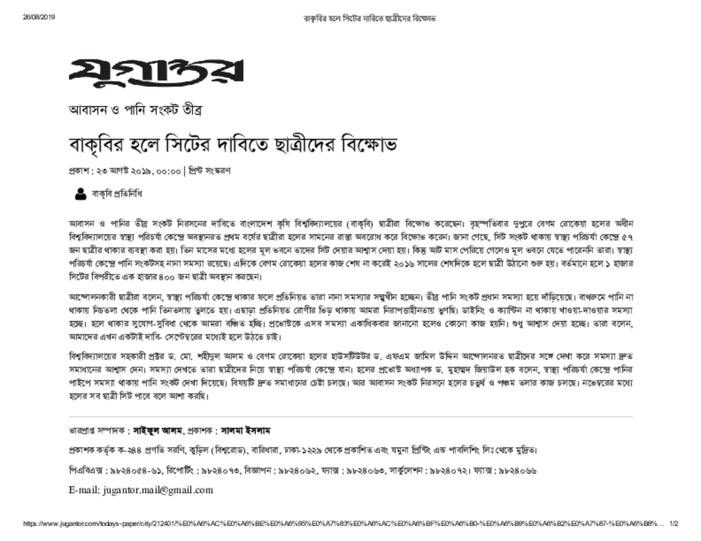 বাকৃবির হলে সিটের দাবিতে ছাত্রীদের বিক্ষোভ Published on Newspaper দৈনিক যুগান্তর Category Professional Education Professional Education Others Download