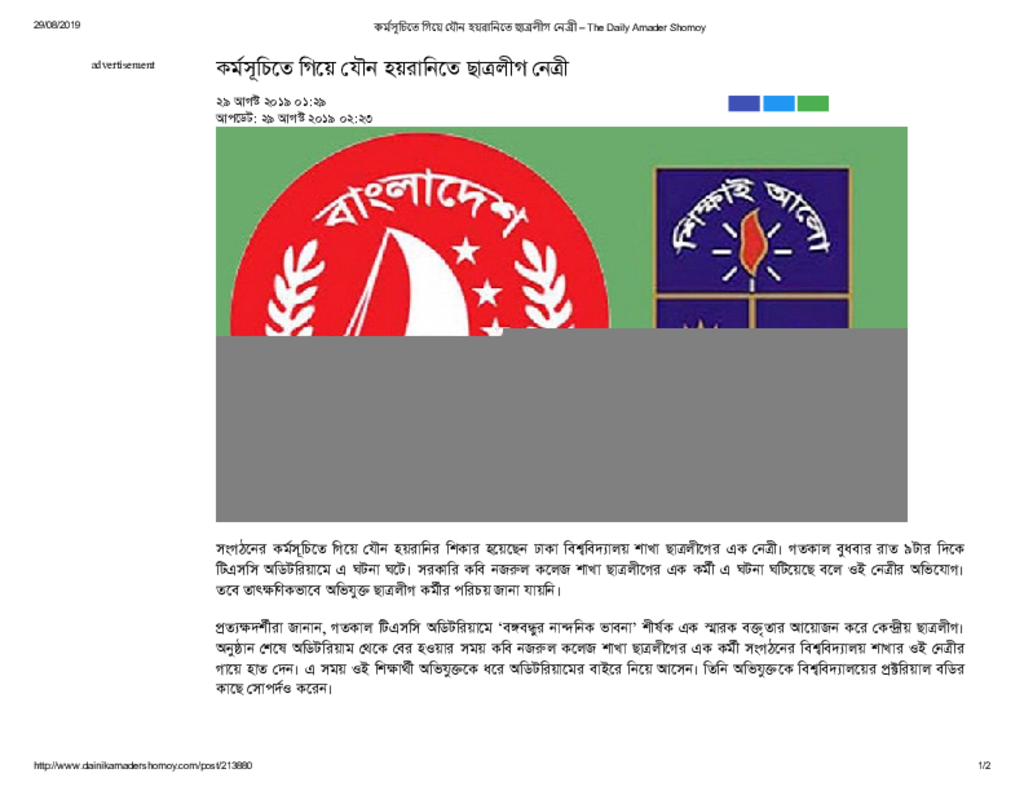 কর্মসূচিতে গিয়ে যৌন হয়রানিতে ছাত্রলীগ নেত্রী – The Daily Amader Shomoy