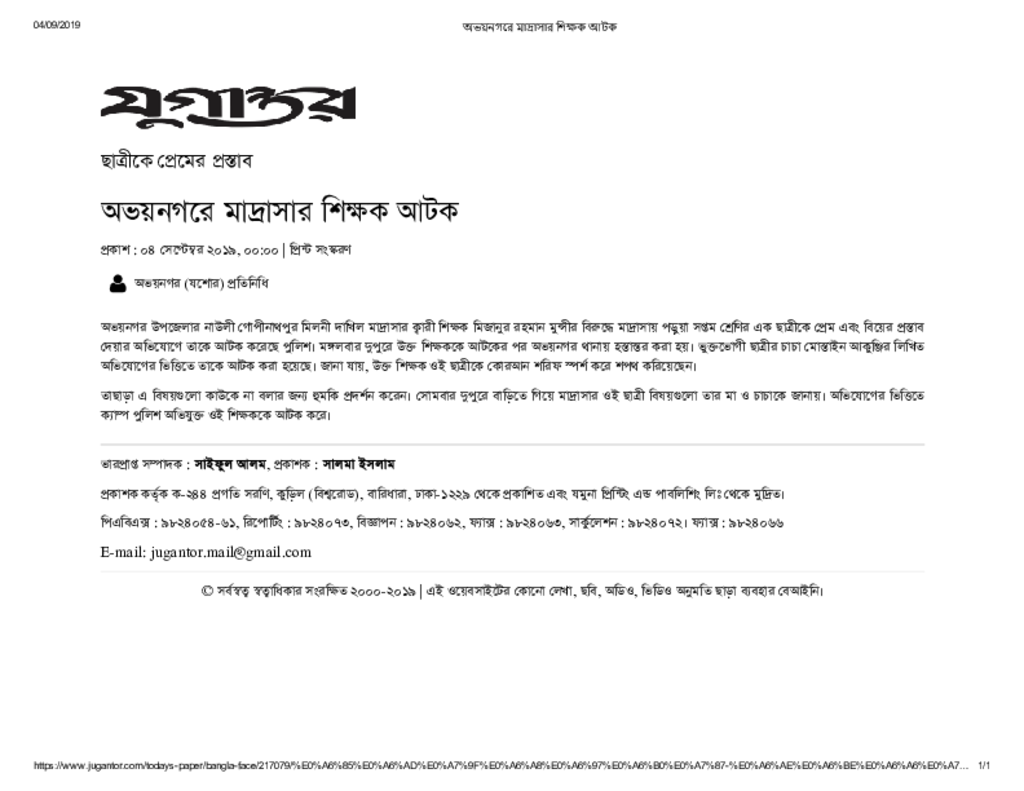 অভয়নগরে মাদ্রাসার শিক্ষক আটক Published on Newspaper দৈনিক যুগান্তর Category Madrasah Education Download