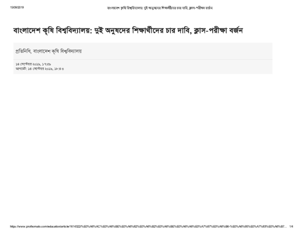 বাংলাদেশ কৃষি বিশ্ববিদ্যালয়_ দুই অনুষদের শিক্ষার্থীদের চার দাবি, ক্লাস-পরীক্ষা বর্জন Published on Newspaper দৈনিক প্রথম আলো Category Professional Education Professional Education Others Download