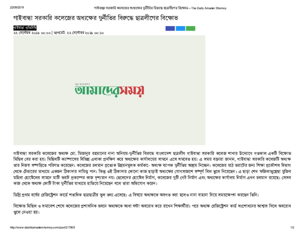 গাইবান্ধা সরকারি কলেজের অধ্যক্ষের দুর্নীতির বিরুদ্ধে ছাত্রলীগের বিক্ষোভ – The Daily Amader Shomoy Published on Newspaper দৈনিক আমাদের সময় Category Others Download