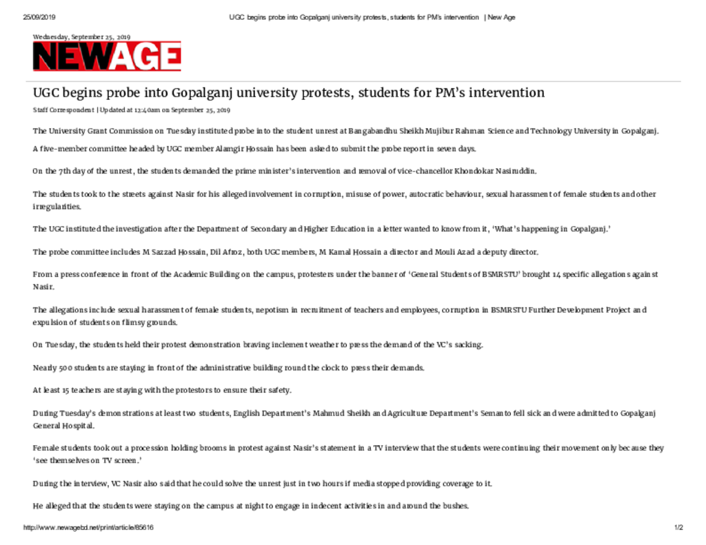 UGC begins probe into Gopalganj university protests, students for PM’s intervention _ New Age Published on Newspaper New Age Category General Education General Education Higher Education Public Download