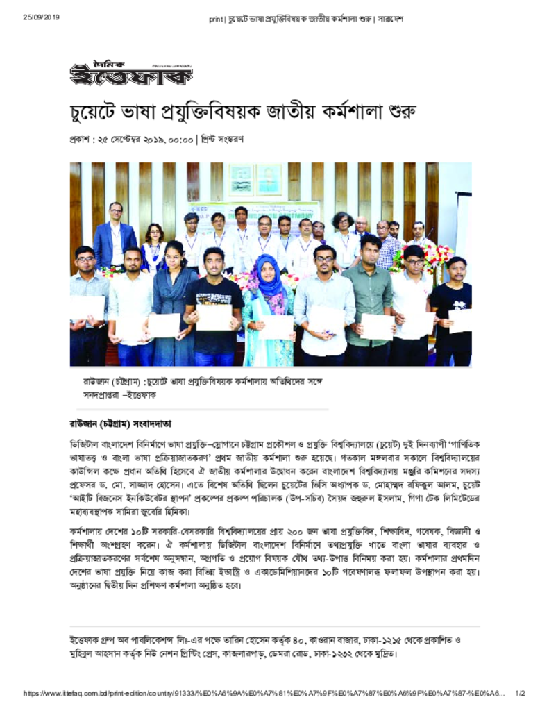 print _ চুয়েটে ভাষা প্রযুক্তিবিষয়ক জাতীয় কর্মশালা শুরু _ সারাদেশ Published on Newspaper দৈনিক ইত্তেফাক Category Professional Education Professional Education Engineering Download