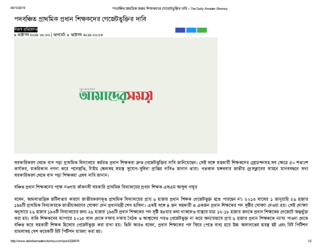 পদবঞ্চিত প্রাথমিক প্রধান শিক্ষকদের গেজেটভুক্তির দাবি – The Daily Amader Shomoy Published on Newspaper দৈনিক আমাদের সময় Category Educational Ministry / Departments Education Ministry / Division / Directorate Download