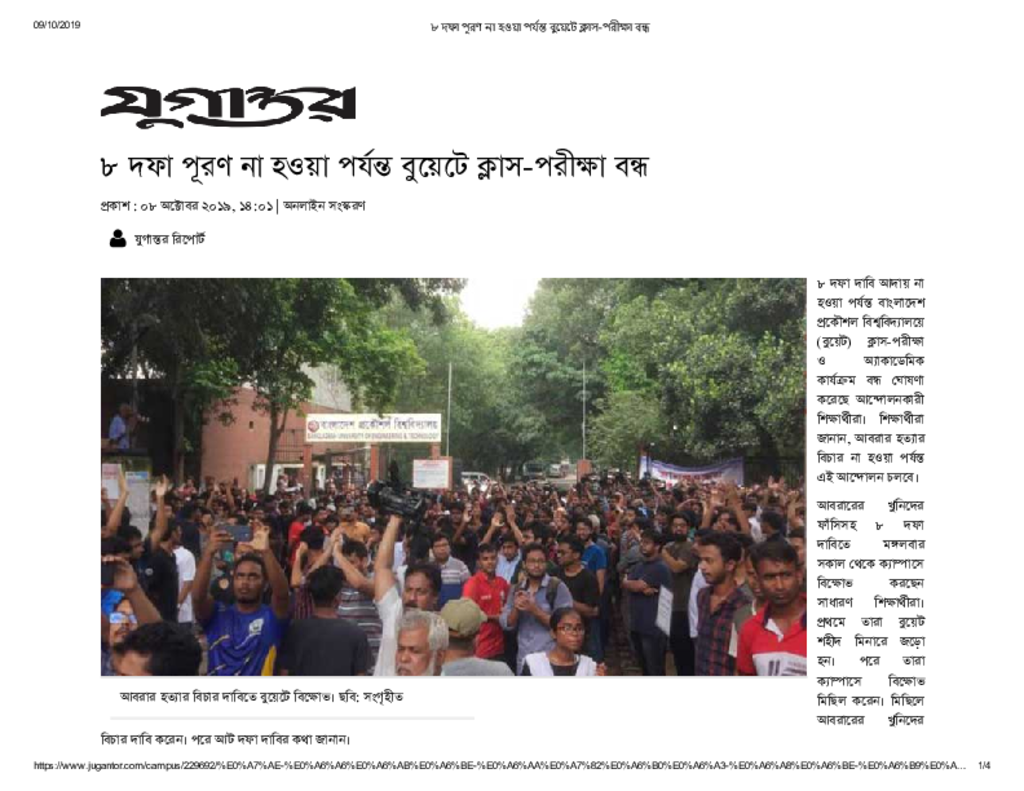 ৮ দফা পূরণ না হওয়া পর্যন্ত বুয়েটে ক্লাস-পরীক্ষা বন্ধ Published on Newspaper দৈনিক যুগান্তর Category Professional Education Professional Education Engineering Download