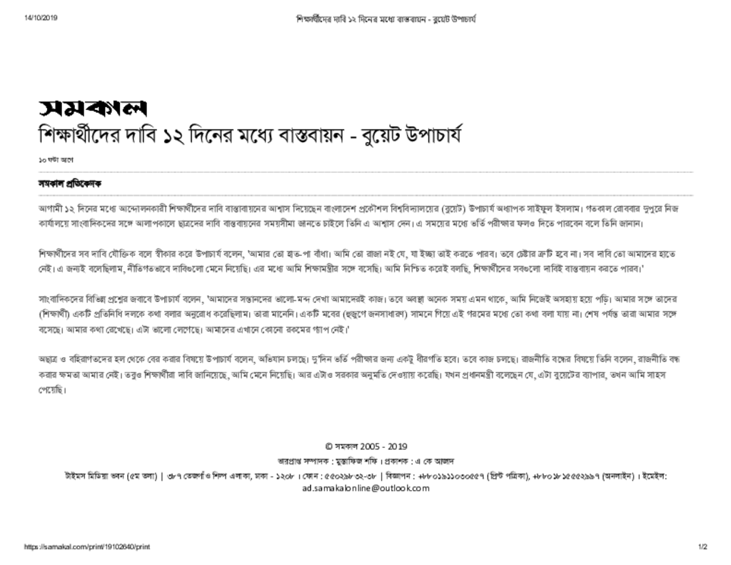 শিক্ষার্থীদের দাবি ১২ দিনের মধ্যে বাস্তবায়ন - বুয়েট উপাচার্য Published on Newspaper দৈনিক সমকাল Category Professional Education Professional Education Engineering Download