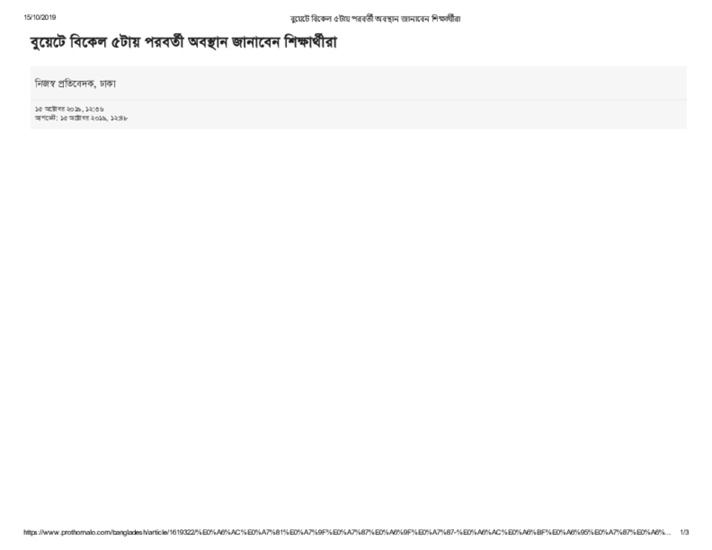বুয়েটে বিকেল ৫টায় পরবর্তী অবস্থান জানাবেন শিক্ষার্থীরা Published on Newspaper দৈনিক প্রথম আলো Category Professional Education Professional Education Engineering Download