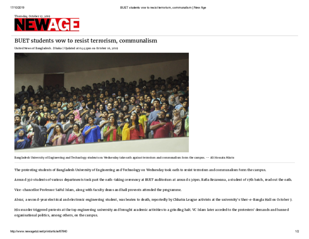 BUET students vow to resist terrorism, communalism _ New Age Published on Newspaper New Age Category Professional Education Professional Education Engineering Download