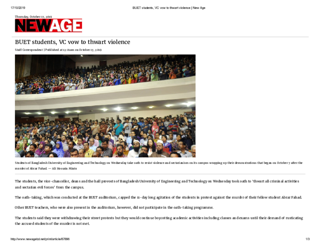 BUET students, VC vow to thwart violence _ New Age Published on Newspaper New Age Category Professional Education Professional Education Engineering Download