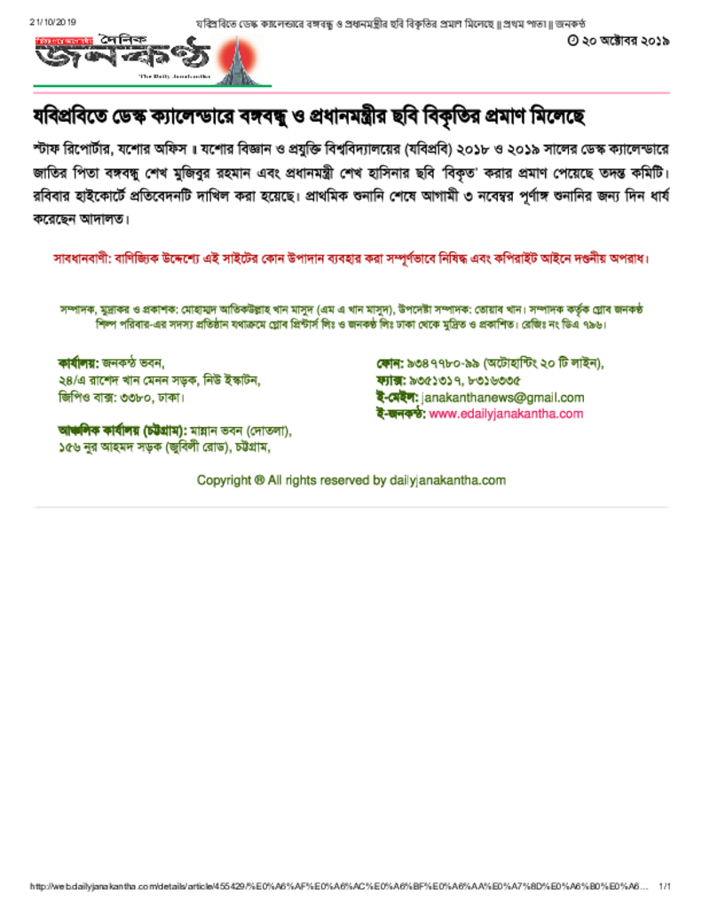 যবিপ্রবিতে ডেস্ক ক্যালেন্ডারে বঙ্গবন্ধু ও প্রধানমন্ত্রীর ছবি বিকৃতির প্রমাণ মিলেছে __ প্রথম পাতা __ জনকন্ঠ Published on Newspaper দৈনিক জনকণ্ঠ Category Science Education Download