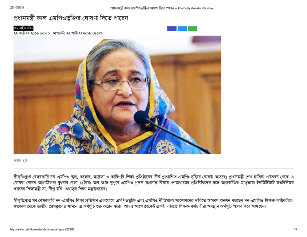 প্রধানমন্ত্রী কাল এমপিওভুক্তির ঘোষণা দিতে পারেন – The Daily Amader Shomoy Published on Newspaper দৈনিক আমাদের সময় Category Educational Ministry / Departments Download