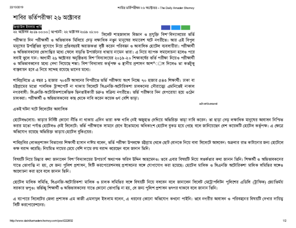 শাবির ভর্তিপরীক্ষা ২৬ অক্টোবর – The Daily Amader Shomoy Published on Newspaper দৈনিক আমাদের সময় Category Admission / Seat Problem Admission/Seat Problem Download
