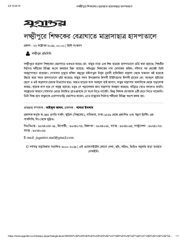 লক্ষ্মীপুরে শিক্ষকের বেত্রাঘাতে মাদ্রাসাছাত্র হাসপাতালে Published on Newspaper দৈনিক যুগান্তর Category Madrasah Education Madrasah Education Alia Download