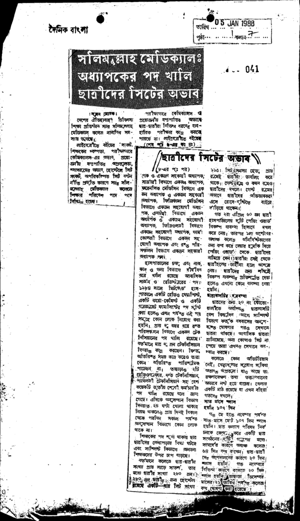 সিলিমুল্লাহ মেডিক্যালঃ অধ্যাপকের পদ খালি ছাত্রীদের সিটের অভাব Published on Newspaper দৈনিক বাংলা Category Professional Education Professional Education Medical Download
