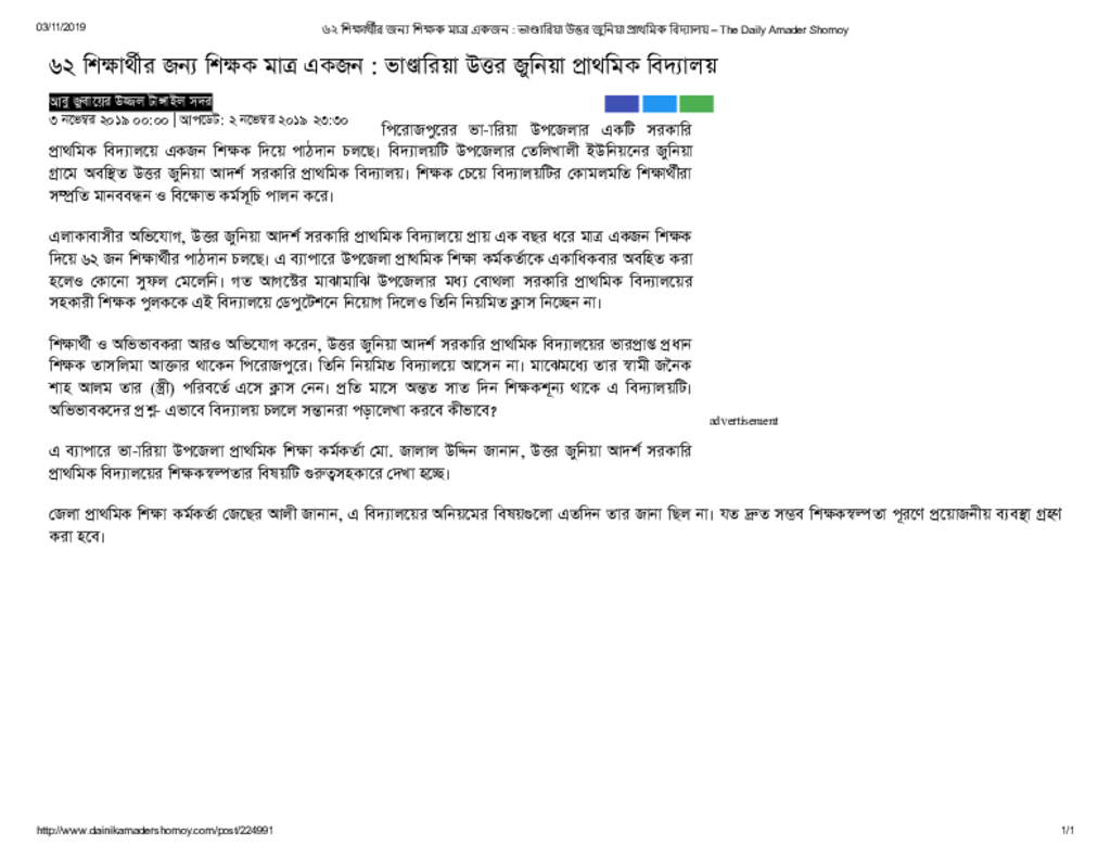 ৬২ শিক্ষার্থীর জন্য শিক্ষক মাত্র একজন _ ভাণ্ডারিয়া উত্তর জুনিয়া প্রাথমিক বিদ্যালয় – The Daily Amader Shomoy