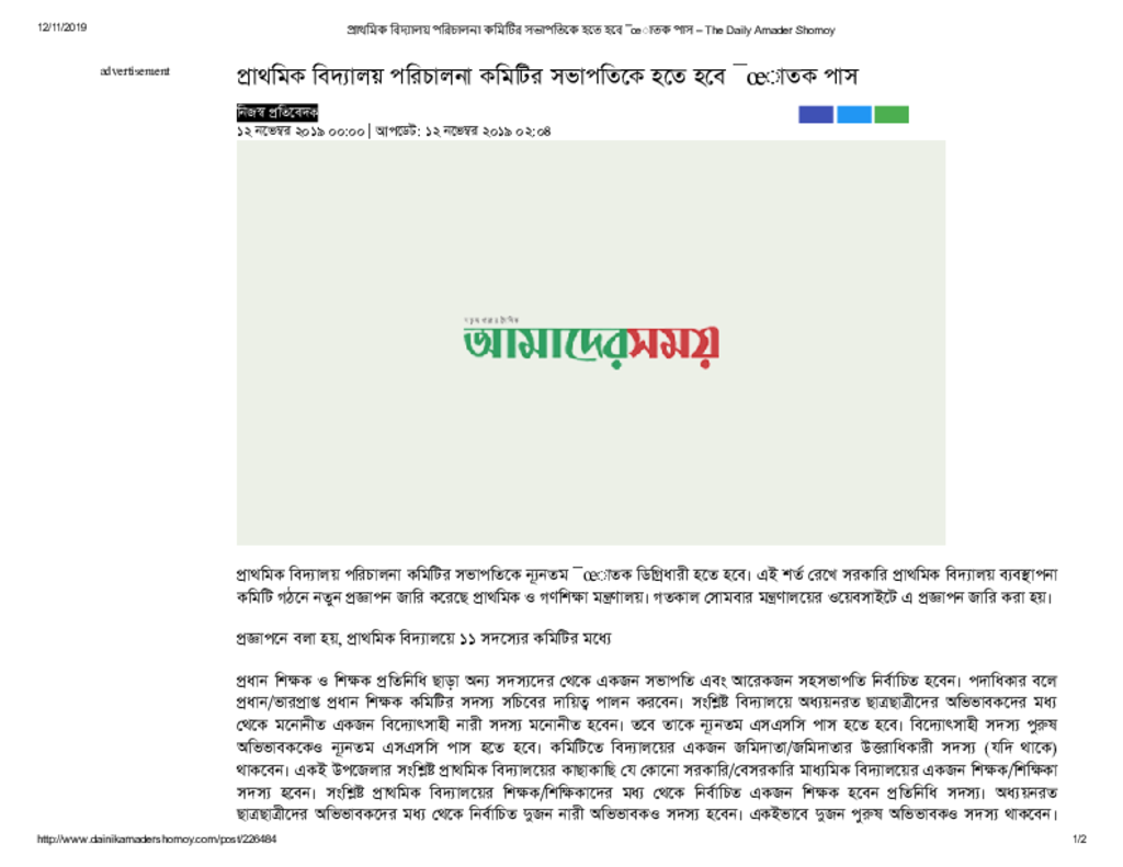 প্রাথমিক বিদ্যালয় পরিচালনা কমিটির সভাপতিকে হতে হবে ¯œাতক পাস – The Daily Amader Shomoy