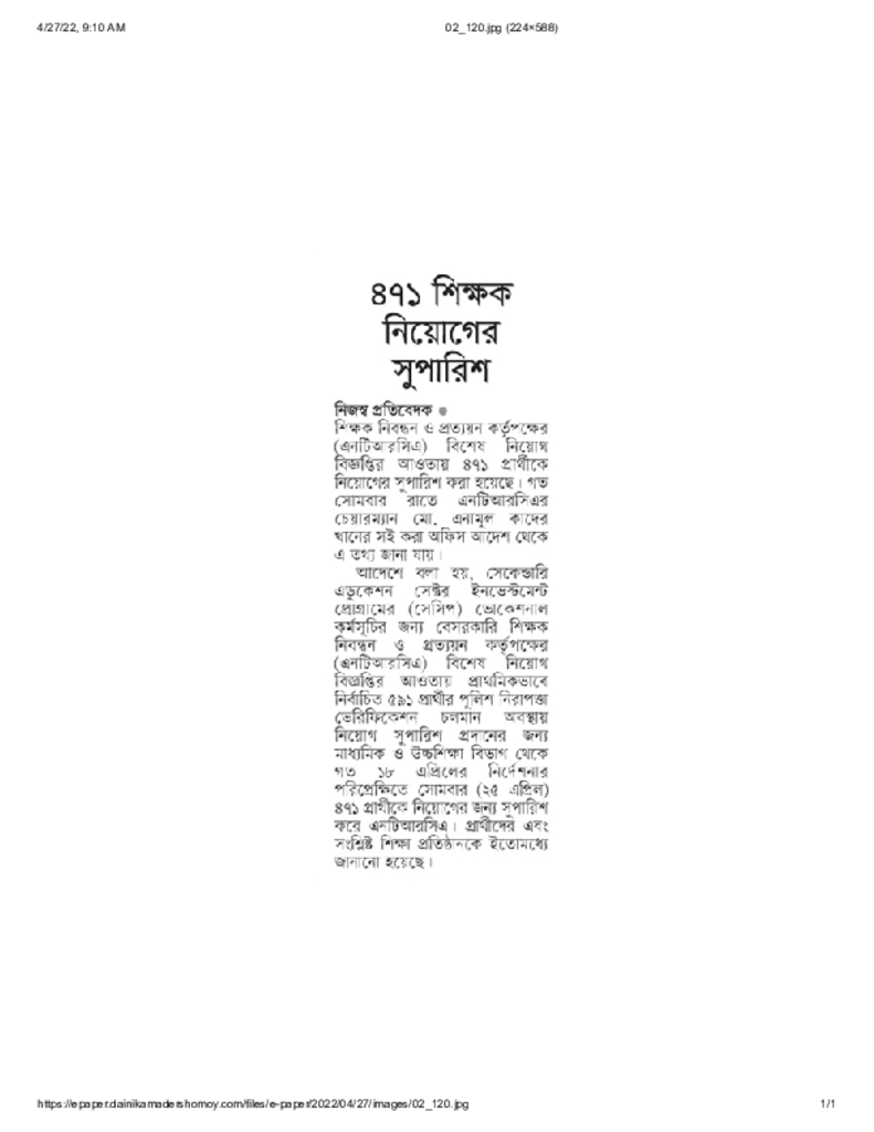 ৪৭১ শিক্ষক নিয়োগের সুপারিশ Published on 27 April 2022 Newspaper দৈনিক আমাদের সময় Category Educational Ministry / Departments Download