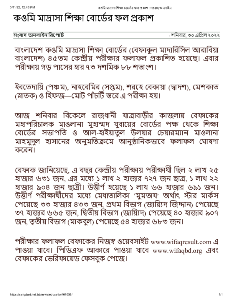 কওমি মাদ্রাসা শিক্ষা বোর্ডের ফল প্রকাশ _ সংবাদ অনলাইন Published on 30 April 2022 Newspaper দৈনিক সংবাদ Category Madrasah Education Download