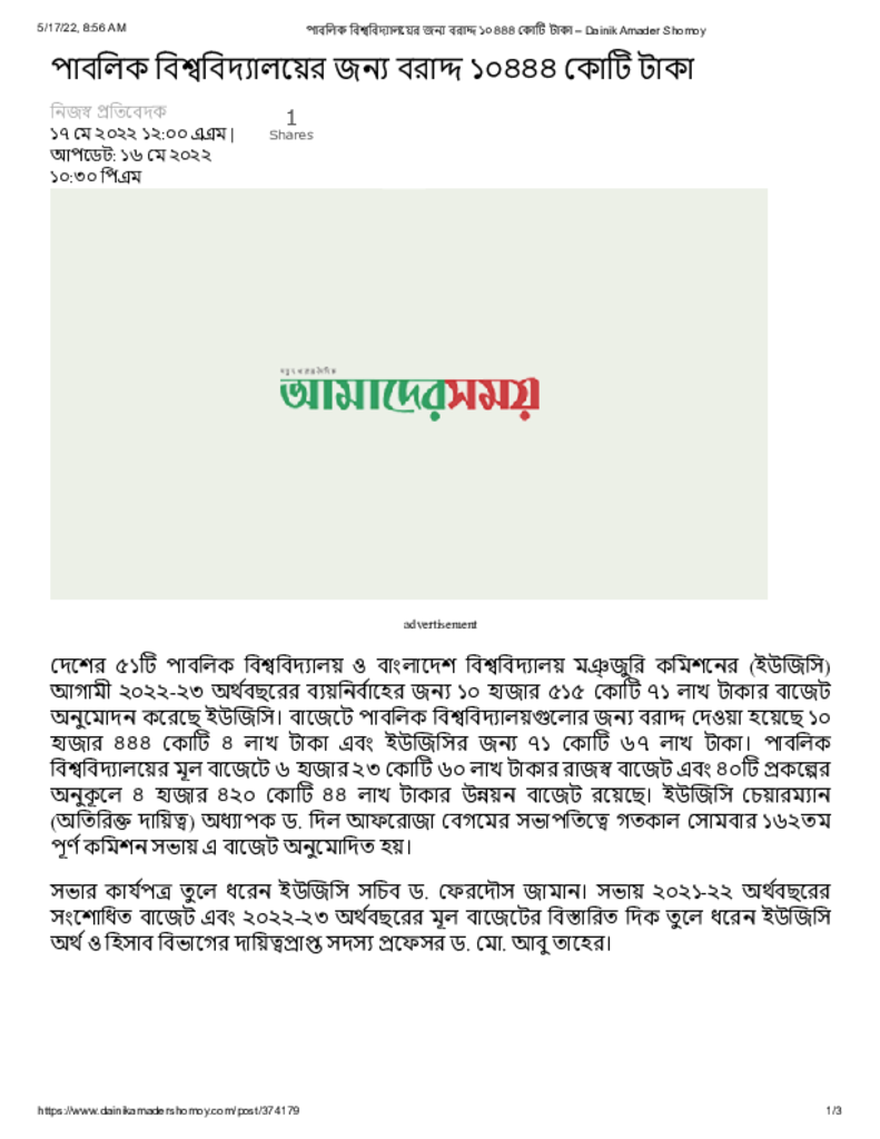 পাবলিক বিশ্ববিদ্যালয়ের জন্য বরাদ্দ ১০৪৪৪ কোটি টাকা – Dainik Amader Shomoy Published on 17 May 2022 Newspaper দৈনিক আমাদের সময় Category General Education General Education Higher Education Public Download