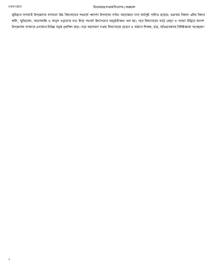 বিদ্যালয়ের শতবর্ষ উদ্যাপন _ সারাদেশ Published on 03 January 2021 Newspaper দৈনিক ইত্তেফাক Category General Education Division Secondary and Higher Education Education Ministry / Division / Directorate General Education Download