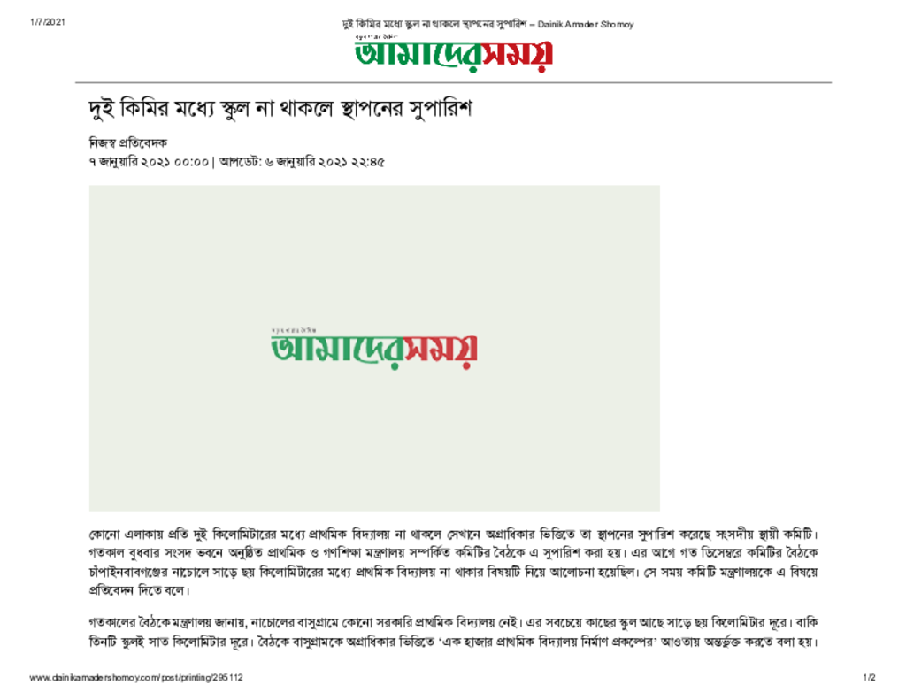 দুই কিমির মধ্যে স্কুল না থাকলে স্থাপনের সুপারিশ – Dainik Amader Shomoy Published on 07 January 2021 Newspaper দৈনিক আমাদের সময় Category Educational Ministry / Departments Download