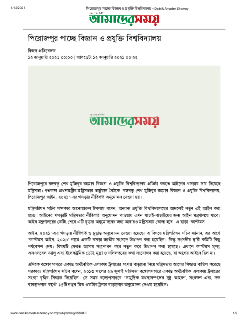 পিরোজপুর পাচ্ছে বিজ্ঞান ও প্রযুক্তি বিশ্ববিদ্যালয় – Dainik Amader Shomoy