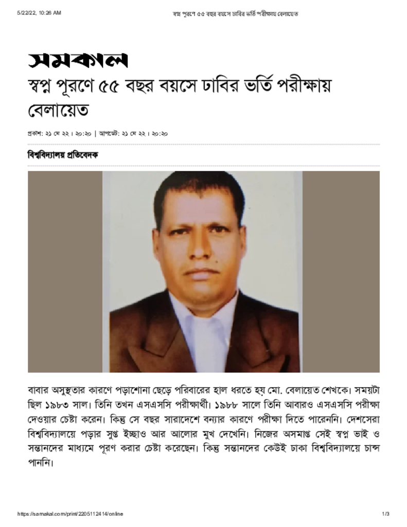 স্বপ্ন পূরণে ৫৫ বছর বয়সে ঢাবির ভর্তি পরীক্ষায় বেলায়েত