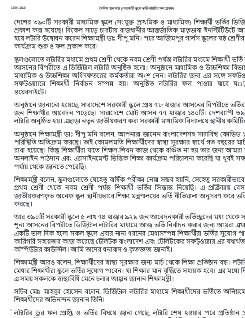 দৈনিক জনকন্ঠ __ সরকারী স্কুলে ভর্তি লটারির ফল প্রকাশ Published on 12 January 2021 Newspaper দৈনিক জনকণ্ঠ Category Educational Ministry / Departments Division Secondary and Higher Education Education Ministry / Division / Directorate Download