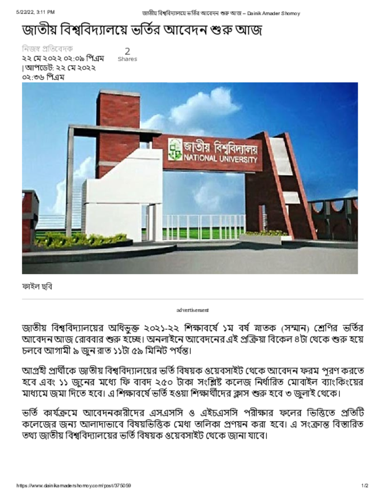জাতীয় বিশ্ববিদ্যালয়ে ভর্তির আবেদন শুরু আজ – Dainik Amader Shomoy Published on 22 May 2022 Newspaper দৈনিক আমাদের সময় Category Admission / Seat Problem General Education Download