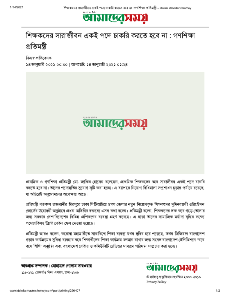 শিক্ষকদের সারাজীবন একই পদে চাকরি করতে হবে না _ গণশিক্ষা প্রতিমন্ত্রী – Dainik Amader Shomoy Published on 14 January 2021 Newspaper দৈনিক আমাদের সময় Category Educational Ministry / Departments Education Ministry / Division / Directorate General Education Download
