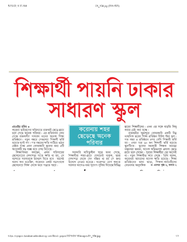 শিক্ষার্থী পায়নি ঢাকার সাধারণ স্কুল Published on 16 January 2021 Newspaper দৈনিক আমাদের সময় Category Admission / Seat Problem Download