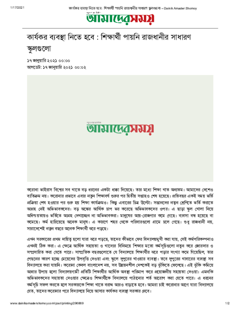 কার্যকর ব্যবস্থা নিতে হবে _ শিক্ষার্থী পায়নি রাজধানীর সাধারণ স্কুলগুলো – Dainik Amader Shomoy Published on 17 January 2021 Newspaper দৈনিক আমাদের সময় Category Educational Ministry / Departments Download
