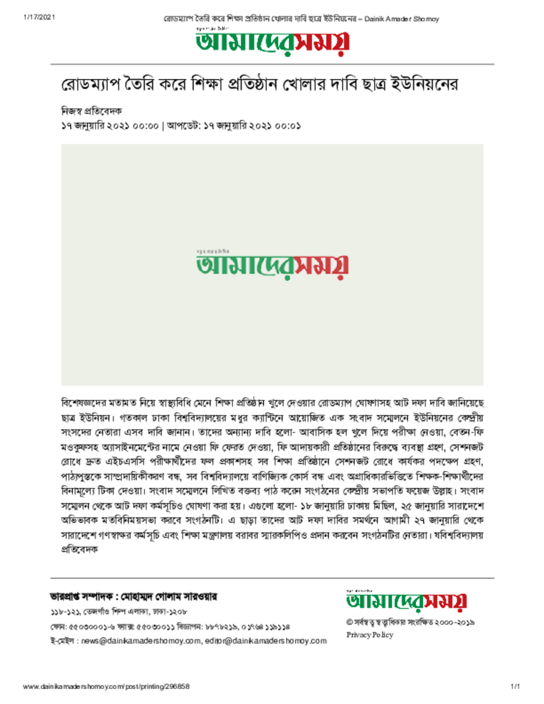 রোডম্যাপ তৈরি করে শিক্ষা প্রতিষ্ঠান খোলার দাবি ছাত্র ইউনিয়নের – Dainik Amader Shomoy Published on 17 January 2021 Newspaper দৈনিক আমাদের সময় Category Others Download