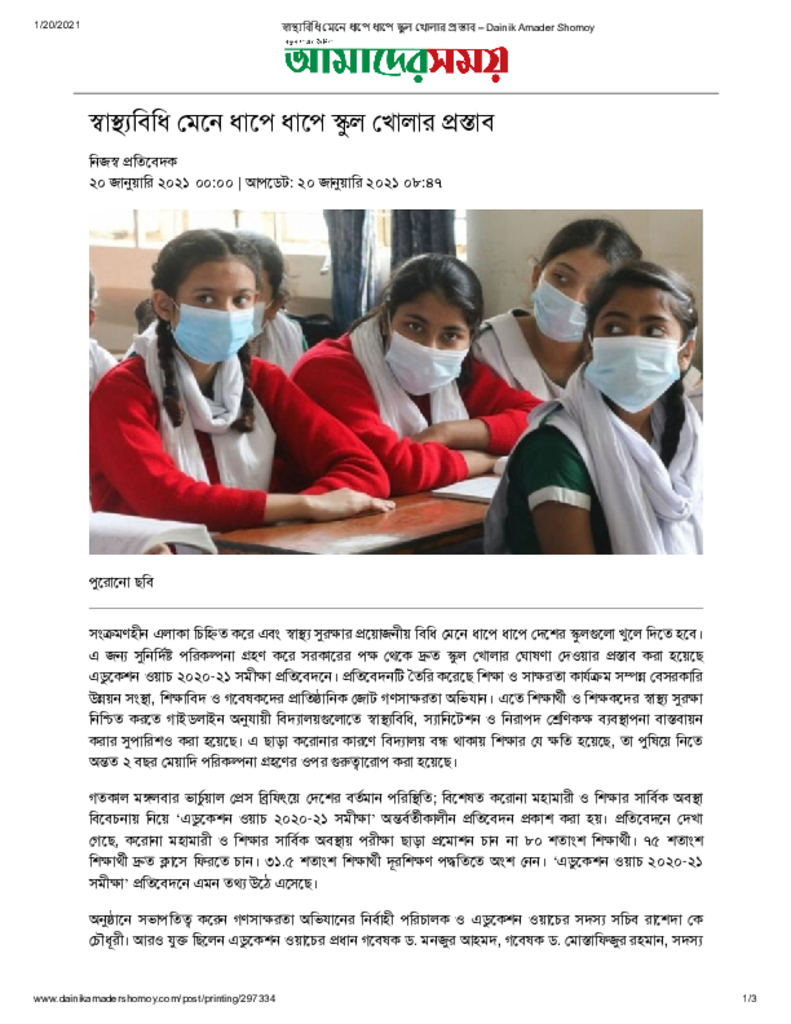 স্বাস্থ্যবিধি মেনে ধাপে ধাপে স্কুল খোলার প্রস্তাব – Dainik Amader Shomoy Published on 20 January 2021 Newspaper দৈনিক আমাদের সময় Category Personal Opinion / Discussion / Commentary Download