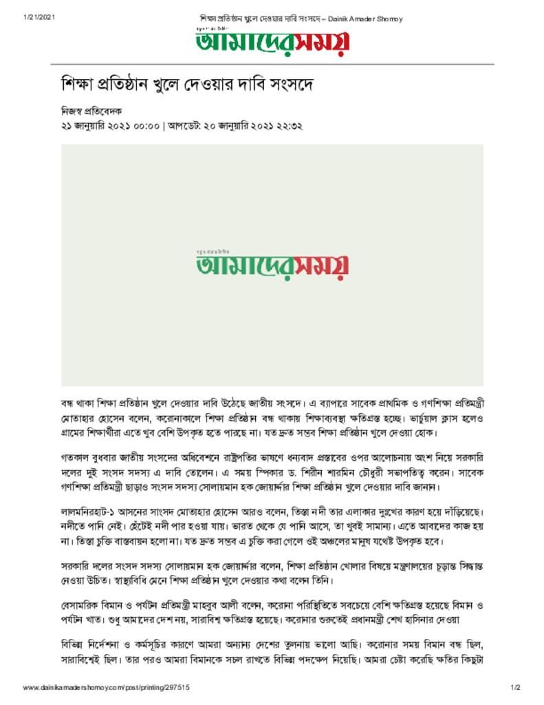 শিক্ষা প্রতিষ্ঠান খুলে দেওয়ার দাবি সংসদে – Dainik Amader Shomoy Published on 21 January 2021 Newspaper দৈনিক আমাদের সময় Category Educational Ministry / Departments Download
