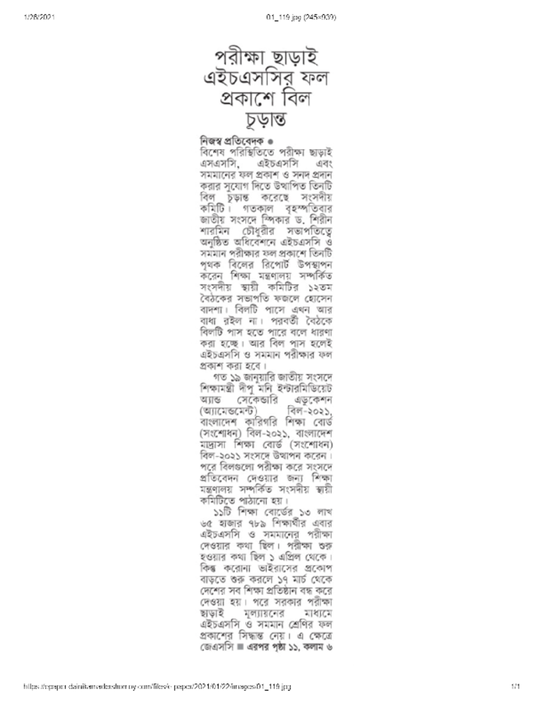 পরীক্ষা ছাড়াই এইচএসসির ফল প্রকাশে বিল চূড়ান্ত Published on 22 January 2021 Newspaper দৈনিক আমাদের সময় Category Educational Ministry / Departments Download