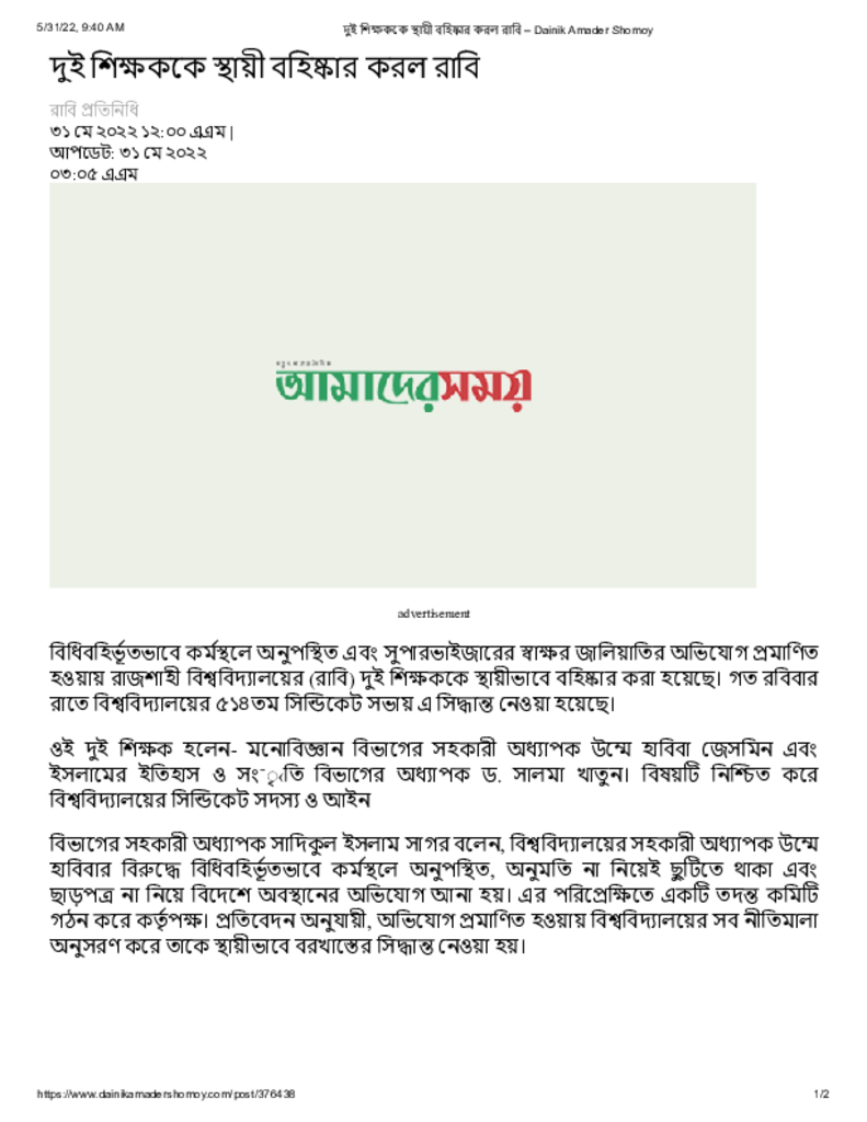 দুই শিক্ষককে স্থায়ী বহিষ্কার করল রাবি – Dainik Amader Shomoy Published on 31 May 2022 Newspaper দৈনিক আমাদের সময় Category Educational Ministry / Departments General Education Download