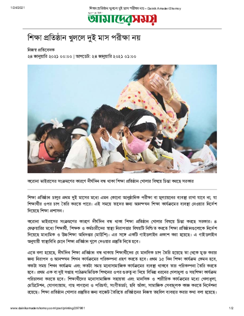 শিক্ষা প্রতিষ্ঠান খুললে দুই মাস পরীক্ষা নয় – Dainik Amader Shomoy Published on 24 January 2021 Newspaper দৈনিক আমাদের সময় Category Educational Ministry / Departments Download