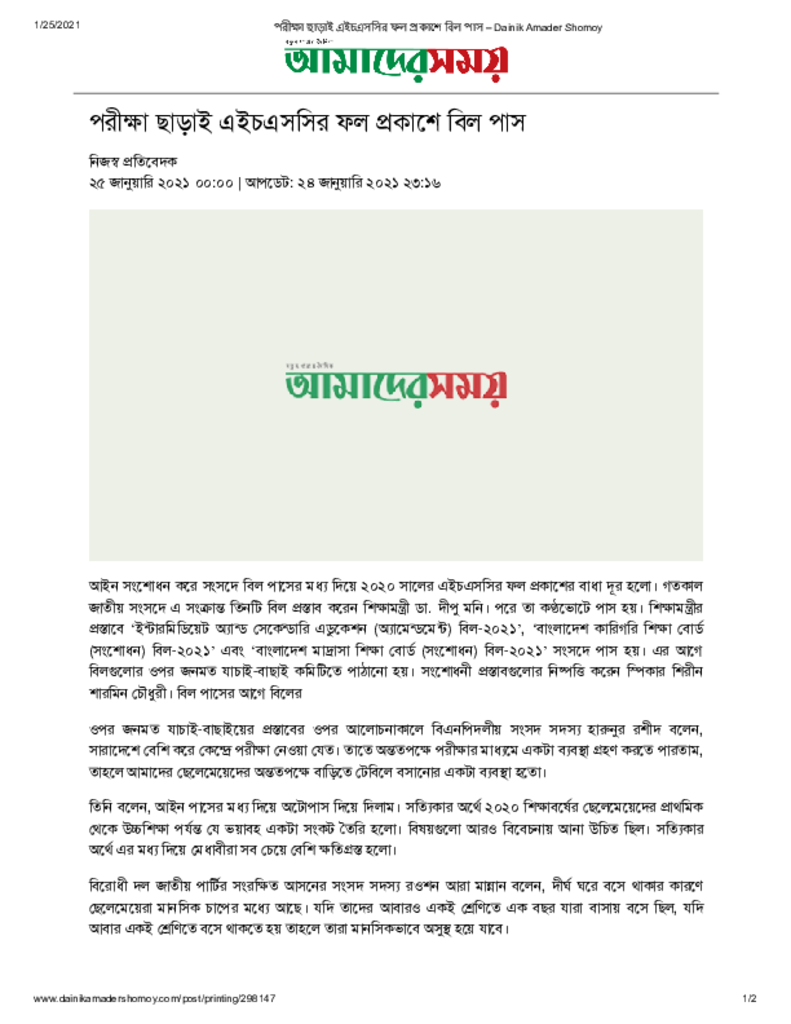 পরীক্ষা ছাড়াই এইচএসসির ফল প্রকাশে বিল পাস – Dainik Amader Shomoy