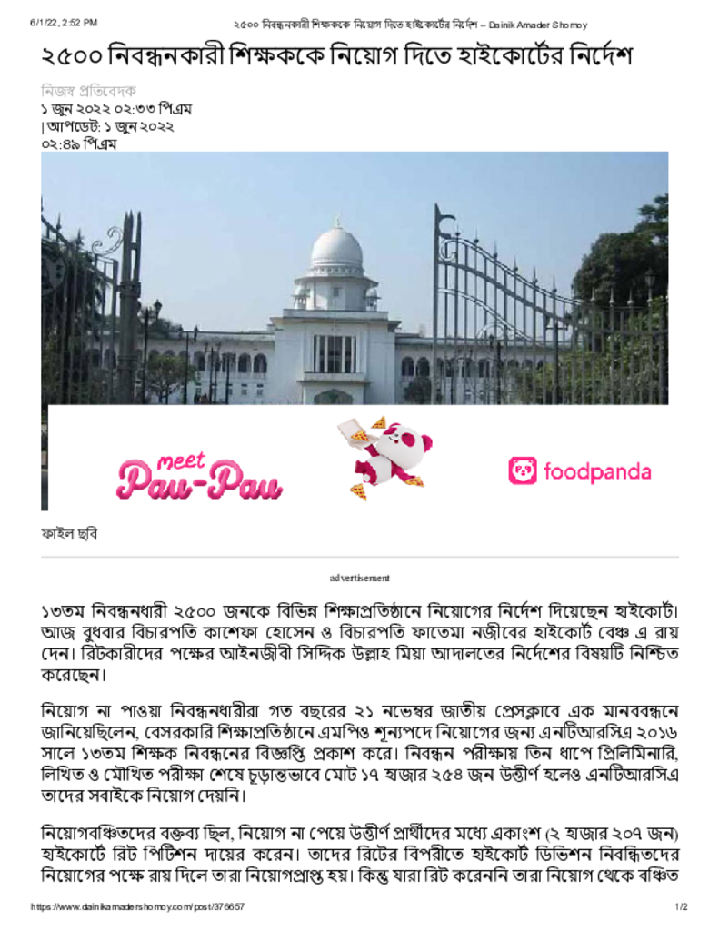 ২৫০০ নিবন্ধনকারী শিক্ষককে নিয়োগ দিতে হাইকোর্টের নির্দেশ – Dainik Amader Shomoy Published on 01 June 2022 Newspaper দৈনিক আমাদের সময় Category Others Download