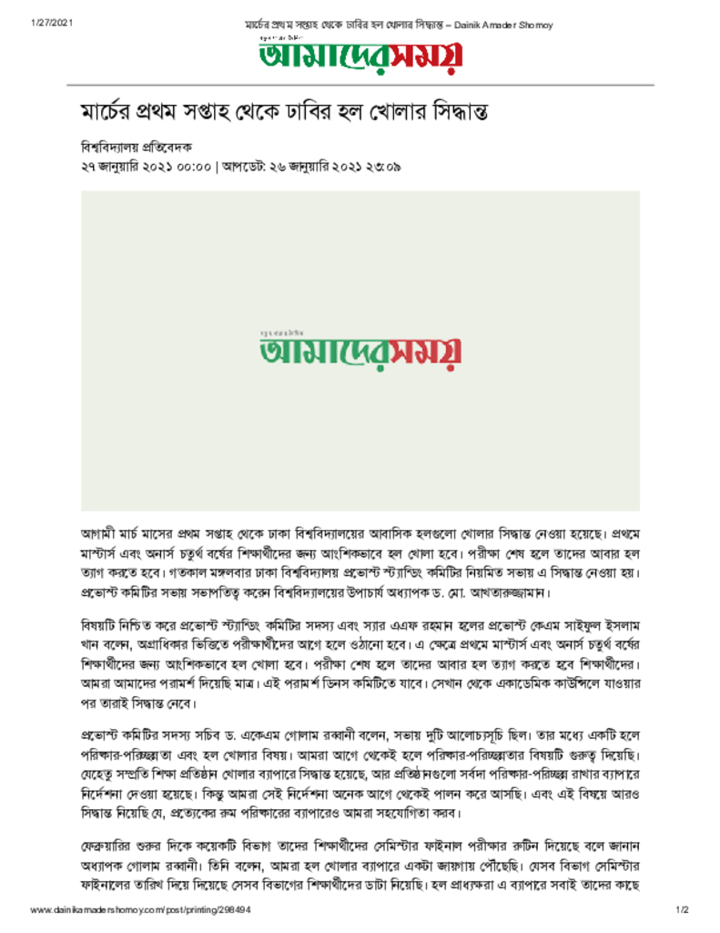 মার্চের প্রথম সপ্তাহ থেকে ঢাবির হল খোলার সিদ্ধান্ত – Dainik Amader Shomoy Published on 27 January 2021 Newspaper দৈনিক আমাদের সময় Category General Education General Education Download