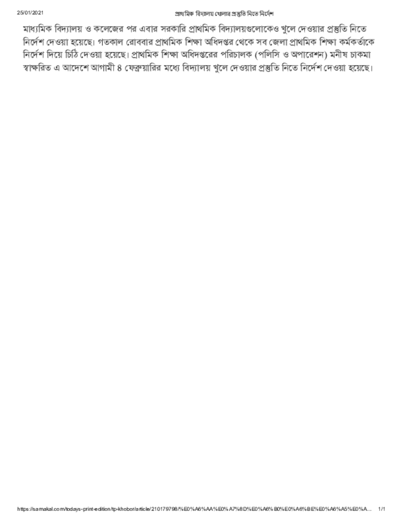প্রাথমিক বিদ্যালয় খোলার প্রস্তুতি নিতে নির্দেশ Published on 25 June 2021 Newspaper দৈনিক সমকাল Category Personal Opinion / Discussion / Commentary directorate Other Education Ministry / Division / Directorate General Education Download