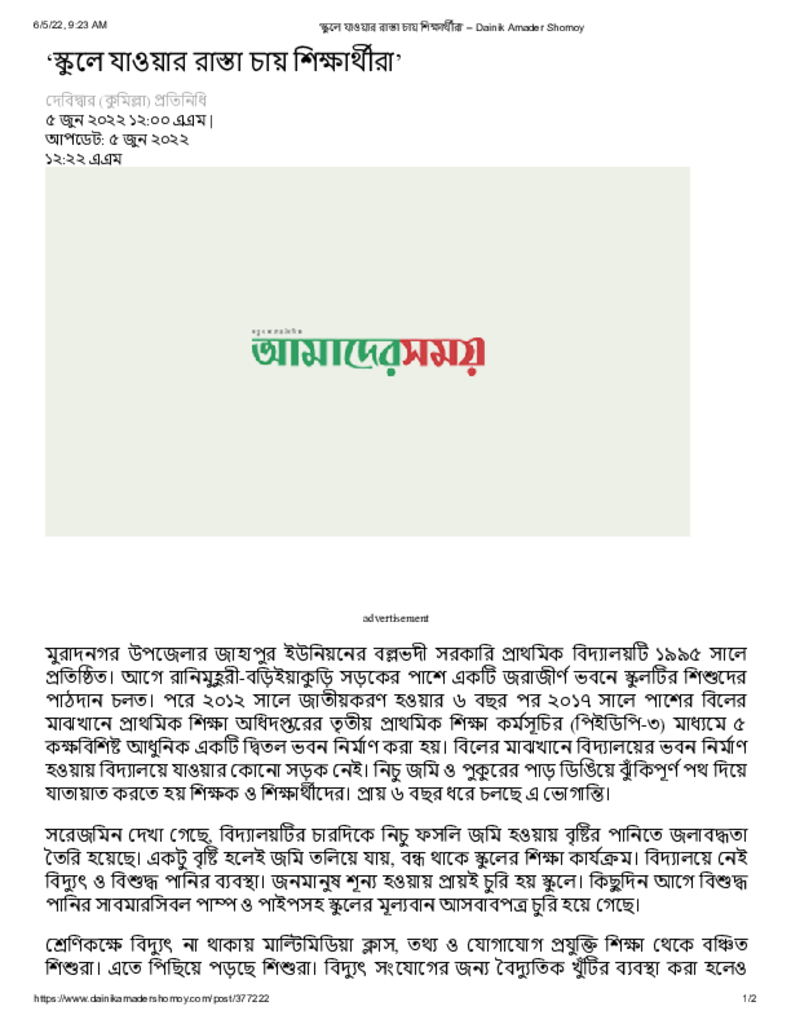 ‘স্কুলে যাওয়ার রাস্তা চায় শিক্ষার্থীরা’ – Dainik Amader Shomoy Published on 05 June 2022 Newspaper দৈনিক আমাদের সময় Category Others Download