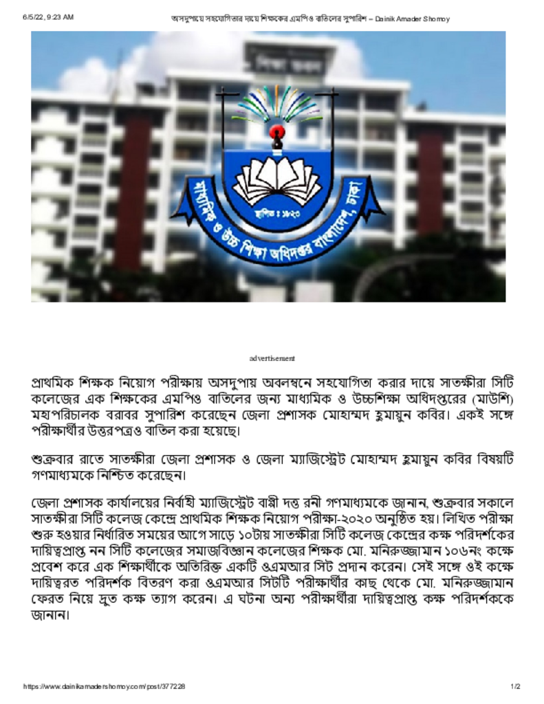 অসদুপায়ে সহযোগিতার দায়ে শিক্ষকের এমপিও বাতিলের সুপারিশ – Dainik Amader Shomoy