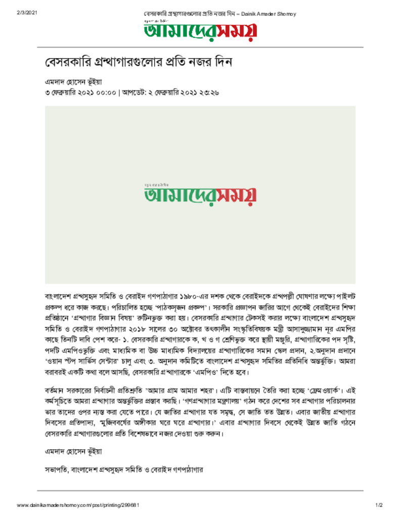 বেসরকারি গ্রন্থাগারগুলোর প্রতি নজর দিন – Dainik Amader Shomoy Published on 03 February 2021 Newspaper দৈনিক আমাদের সময় Category Personal Opinion / Discussion / Commentary Download
