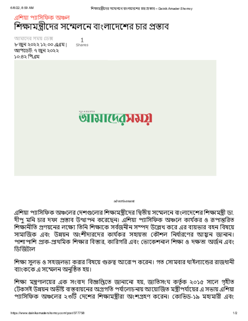 শিক্ষামন্ত্রীদের সম্মেলনে বাংলাদেশের চার প্রস্তাব – Dainik Amader Shomoy